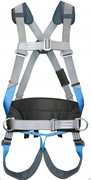 Страховочная привязь с широким поясом для фиксации спины. Пояс имеет боковые D-образные кольца для рабочего позиционирования и удержания. Одно D-образное кольцо на спине(снабжено удлинителем стропа, выводящим устоойство в зону досягаемости работника) и две крепёжные петли спереди для страховки. Разёмные регулировочные пряжки на наплечных и набедренных лямках позволяют быстро подогнать привязь по размеру.