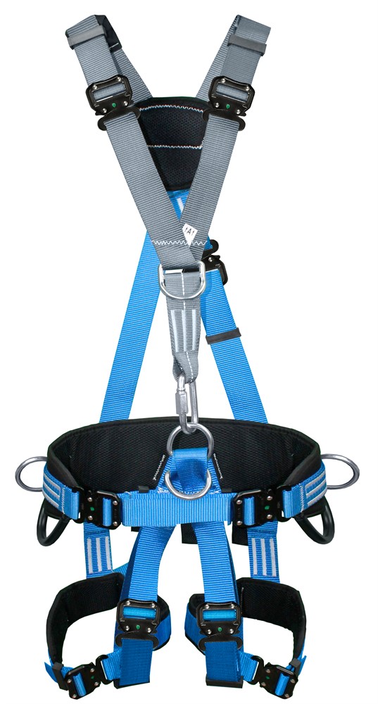 Страховочная привязь парашютного типа с наплечными и набедренными лямками которые регулируется самофиксирующимися пряжками, двумя элементами крепления стропа для страховки(на груди и спине) и тремя - для удержания и позиционирования(на поясе).