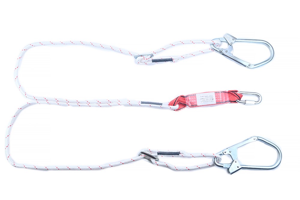 Строп аВрегд К50+Кс (канат в оплетке) - страховочный строп, двойной (двуплечий) регулируемый из капроновой верёвки с амортизатором, двумя большими монтажными и одним соединительным карабином.